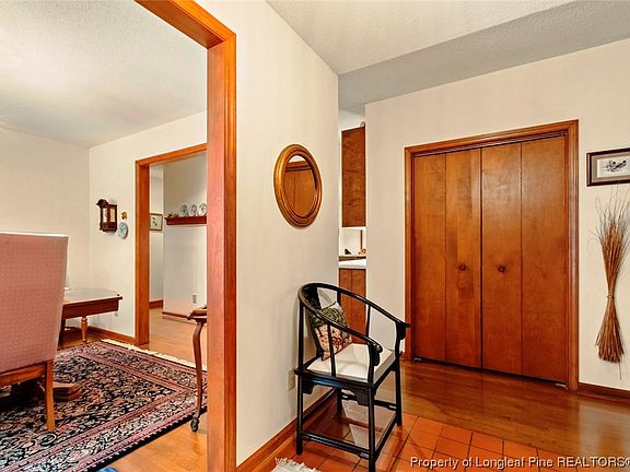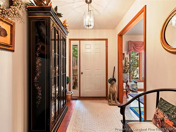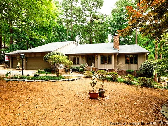 Get ready to be WOWED! This home has beauty, charm, coziness and could be yours! It’s a well-built cedar sided home in Carolina Trace - Golf East, and has so much to offer. Split floorplan. Hardwood floors, tile in kitchen w/breakfast eating area, formal dining room, living room w/wood-burning fireplace & equipped for a gas log fireplace (just needs the tank), cozy and spacious sunroom overlooking the level, large, fenced backyard. Great den with wood-burning fireplace. Partial finished heated basement for an office or man cave, partial unheated storage area. Two car garage w/utility sink, separate attached golf cart garage. New roof 12/2022, new HVAC 2017, new water heater 10/2022, gutter guards, golf cart garage 4/2000, extended deck 4/2000, Updates: kitchen Corian counter 2013, master bath – tile floor, shower 2007, new counter in guest bath 2007.