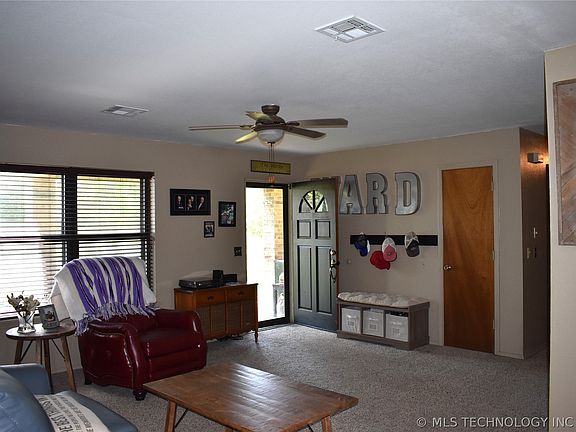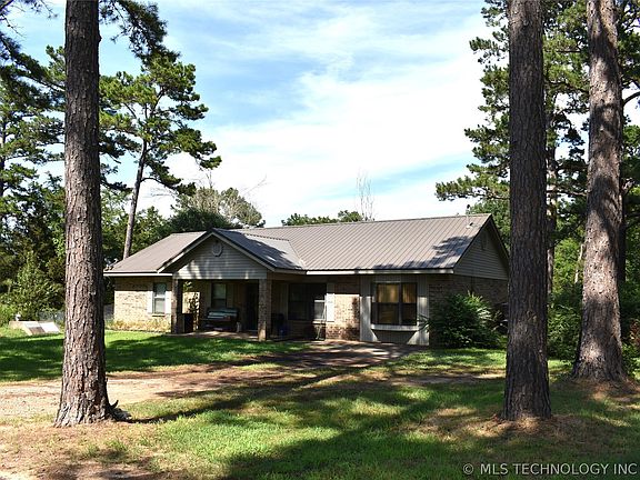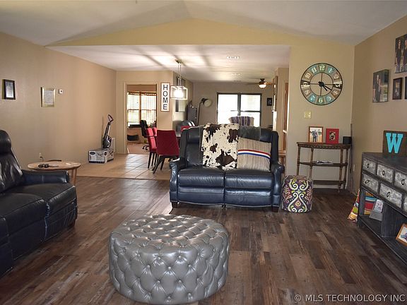 The gorgeous, 2,498 square foot home offering an open-concept with two living areas, with a wood-burning fireplace, large dinning aera, and kitchen with a breakfast bar. The owner's suite has a spacious bedroom and private bathroom with a stand-up shower, and a luxurious jetted bathtub, offering a private retreat after a long day. There are four guest bedrooms, one full bath and a half bath. This home boast ample space for a growing family or accommodating guests. Outside, the property is adorned with towering pine trees that provide shade and privacy. A highlight of the outdoor space is the patio and large back yard with storm cellar, offering peace of mind during inclement weather. This is a special place you'll definitely want to see if you are looking for a terrific place to call your own near abundant outdoor recreational opportunities, including nearby lakes, rivers, ATV and horse-riding trails, public hunting land, casinos.