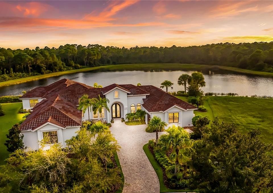 Crowning the finest lake homesite in The Concession, this 2015 custom one-story is enviably situated on 300' of inspiringly expansive and completely private water vistas. Poised on over half an acre at the end of a cul-de-sac, fusing sophisticated elegance and the quintessential quality of a home designed by Anchor Builders, this 4-bedroom green-certified residence is designed to be lived in and heartily enjoyed. Upon entering, you'll be struck by views towards the pool and water, with a lush tree-scape in the distance. The floor plan has been thoughtfully orchestrated on one level with a secluded master wing, an oversized office, open areas for entertaining, bonus room, and three additional bedrooms - each with their own walk-in closet and bath. The deluxe chef's kitchen is equipped with a massive island with quartz counters, walk-in pantry, Sub-Zero fridge, Wolf range, and Bosch dishwasher. A hallmark for gathering and entertaining, the circular dining room is enveloped by windows all leading to the views beyond. A multitude of French doors connect the interior with the pool terrace creating an epic outdoor living space. Sunseekers will love relaxing on the open pool deck with PebbleTec saltwater pool. Remote controlled screens come down over the lanai where a gas fireplace is the perfect cap on a winter's day. Hurricane impact windows and doors bring peace of mind to further enjoy living on Florida's Gulf Coast near beaches, shopping, dining, and culture.