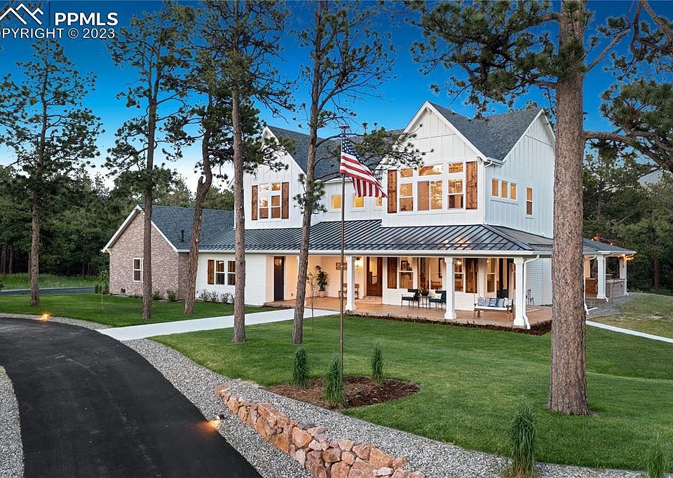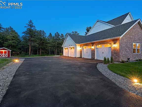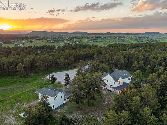 Come sit on the porch and enjoy the peace, tranquility, and space of this gorgeous treed 4.39 acre property that has a main house and guest house. The well designed outside living area invites you into this 5,588 sq.ft. home which boasts an open and bright concept. That's right! Bright home in the Black Forest. As you walk into the main level the 8' beautiful solid knotty alder doors and dining room beams accentuate the height of the ceilings. The large south facing window behind the 48" commercial style gas range with griddle is accentuated by brick and brings in a lot of natural light. The large bedroom on the main level can be used as a home office or junior suite. The mudroom and adjoining closet has plenty of room for Colorado Days where you may need a wind breaker one moment and a winter jacket the next. Bring the comfort of the indoors to the outdoor living area with the 15 foot glass patio door that opens up to 10 feet where you can walk out to relax and listen to the water fall or get warmed by the infrared heaters or wood fireplace. The oversized five car tandem garage is over 2,000 sq.ft. and makes grocery hauls easy with it's own pantry. The primary bedroom feels like you are living in the trees without the nuisances of living in the trees. The primary closet is huge with it's own full size washer and dryer, and an additional closet within the closet. Right next to this amazing closet is the primary bathroom that is an oasis with heated floors and a zero entry shower. On the other side of the upper area are two big bedrooms that have their own private baths with their own laundry room. The in-ground basement also boasts the 8' beautiful solid knotty alder doors, exercise room, kitchenette, a large bedroom, bathroom, another laundry room, and a mechanical room that has two furnaces with four zones, two tank-less water heaters, and the HALO ion whole house water filtration system that also filters the water to the guest house. WELCOME HOME!