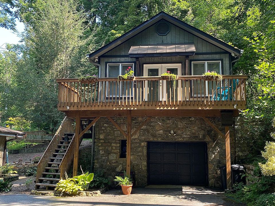 -A truly magical place! Enter through gates, over a bridge and waterfall, past a pond and whimsical statuary into a fantasy world. This remarkable one level stone cottage has a newly remodeled kitchen, a raised ceiling & exposed stone fireplace in the living room. It sits on a bold creek and includes a 600 sq.ft. private guest room. The home is in immaculate condition with hardwood floors, renovated bath, cedar lined closets, 2 fireplaces, and numerous windows to let the outside in. Walking paths, two decks, one with a fire pit!