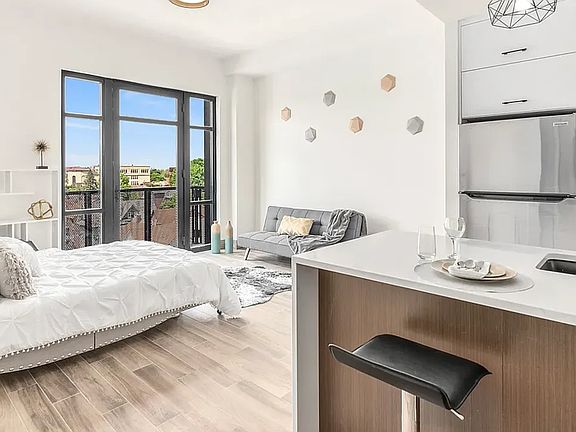 Welcome to The Posh, a finely crafted 43 unit boutique rental building located in Midwood, Brooklyn. Unit 408 is a a corner spacious studio with a balcony Cooking Gas & Hot Water included The dynamically designed units boasts open layouts, porcelain floors, high ceilings, large expansive floor to ceiling windows, open modern kitchens with quartz stone countertops, light wood tone cabinetry and lacquered finishes. The stainless steel appliances include a gas range, dishwasher, microwave and double kitchen sinks. The apartment comes with ample closet space, an oversized bathroom with a tub, split heating & cooling systems, and in-unit washer & dryers. Each apartment features private balconies or terraces. Building amenities include two elevators, a fitness center, furnished roof deck with panoramic views of Brooklyn and Manhattan, residents lounge that features wifi, cable television and a grand wet bar with direct access to a furnished terrace outfitted with a yoga deck, seating and barbecues. Additional amenities include a secured package room, storage, bicycle storage and a parking garage equipped with electric vehicle charging stations. The Posh is located on the corner of Coney Island Ave & Ave P and is only a few blocks from the B & Q Trains at Kings Highway as well as surrounded by an array of stores, restaurants & cafes. Amenities: - Tenant Lounge with Wifi & Cable TV - Gym - Yoga Deck - Bike Storage - Elevator - Roof Terrace w BBQ grills - Package Room - In-Unit Washer/Dryers - Roof deck with Brooklyn & City Views - Pets Allowed - Guarantors Allowed