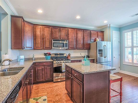 Stunning Ashford model in Cresswind, the most highly sought after active adult community in Myrtle Beach. This bright and airy home features an open floor plan with spacious living areas and bedrooms. You will first notice the beautiful hardwood floors including newly installed matching hardwood floors in the bedrooms and closets, with the exception of tile floors in the bathrooms and laundry room. Stylish crown molding throughout the home adds character and warmth. The spacious kitchen features granite counter tops, stainless steel appliances with gas range, breakfast bar, ample cabinet storage with work island, updated subway tile backsplash, and decorative plantation shutters on the windows. The master bedroom suite features a tray ceiling, his and her closets with newly installed hardwood floors, and an oversized walk-in tiled shower with seating. The exterior of the home is hardy plank siding and offers a welcoming front porch where you can watch the sunset. A large screened back porch, and an extra large patio with pergola, allows you to relax in the fenced-in back yard and watch the sunrise. Custom shelving has been installed around the perimeter of the garage which allows for greater storage capacity. The garage also has pull down stairs and over-garage storage which is spacious enough to convert to a third bedroom. The meticulously landscaped property has been upgraded with curb scaping and mulch in the garden beds. This natural gas home features a tankless water heater. The monthly HOA includes all lawn care, irrigation, internet, security system, a 12,000 sq. ft. clubhouse, resort-style pool with cabanas and a hot tub, fitness center, tennis courts, pickle ball courts, bocce ball, horseshoes, outdoor amphitheater, outdoor fire pit, indoor and outdoor kitchens, miles of walking trails and much more! Cresswind is located within Market Common and just a quick golf cart ride to the beach and Myrtle Beach State Park, and a short distance to the airport, Coastal Grand Mall and Murrells Inlet Marsh Walk waterfront dining. Don't miss out on this incredible home so you can live this fabulous lifestyle!