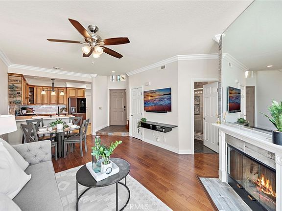 Nestled close to lifestyle amenities and showcasing magnificent views that stretch from Lake Forest to the ocean, Catalina and San Clemente Island, this 3 bedroom 3 full bathroom townhome is sure to impress. Upon entering, you're greeted with a breathtaking view and an open floor plan that maximizes space with an abundance of natural light. The spacious kitchen is incredible with warm wood cabinets that couples wonderfully with the marble-tile backsplash and ample quartz counter. The kitchen also boasts new appliances that feature top tier tech and functionality. The cherry wood floors throughout and lightly painted walls provide a timeless look that also happens to be this season's standout style. The inviting living room features a cozy fireplace creating a relaxing space to unwind from the day. Head outside to the large private patio and dine alfresco, host family and friends, or create a space for the kids all while enjoying stunning views and sunsets that set directly behind the home. Conveniently located on the first floor is a bedroom and full bathroom. The direct-access one-car garage houses the washer and dryer for added convenience.