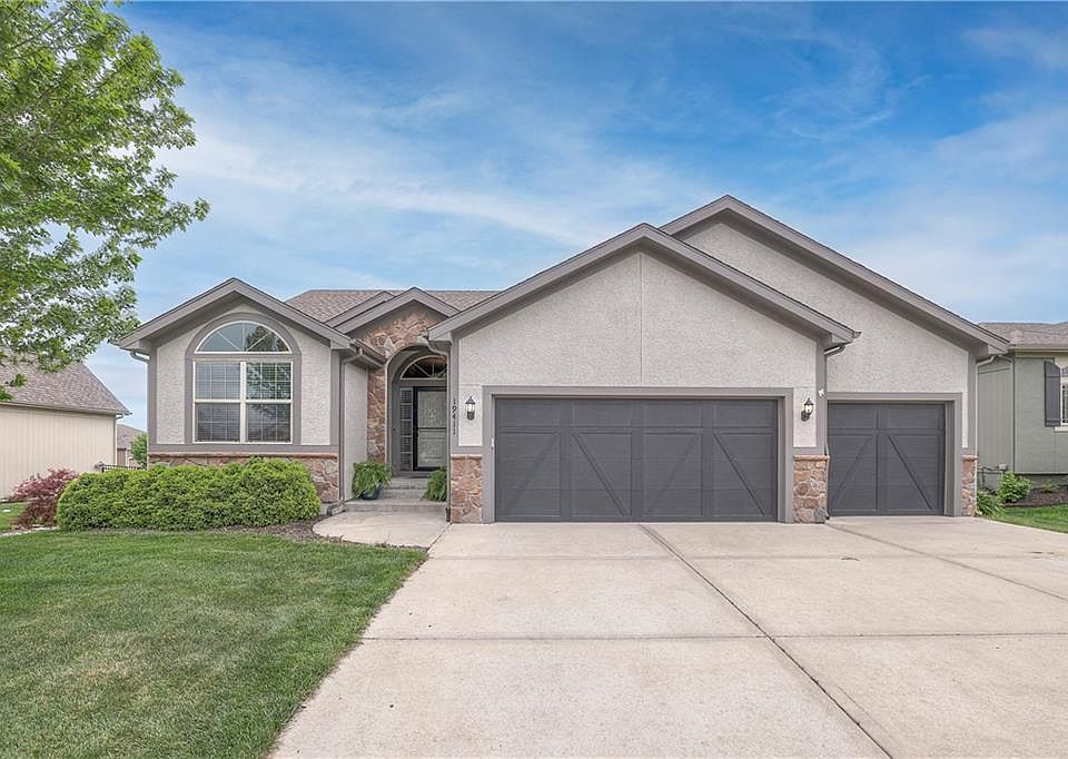 Estates of Wolf Creek stunner ready for new owners. Move in fast! Welcome home to this reverse 1.5 story spacious and stylish floor plan with five bedrooms (three on the main level) and 3 full bathrooms. Soaring ceilings, loads of windows, primary suite is beautiful and efficient, gorgeous bathroom with large shower and separate tub, double vanities, and the laundry room connects to the massive primary walk in closet. Smart!! Imagine making memories in this kitchen with tons of counter space, dining area and large pantry. Watching Chiefs games or entertaining in the living room with rock facade fireplace and hanging out on the covered deck drinking coffee and overlooking this lovely yard. The lower level has added finished space and a kitchenette along with two well appointed bedrooms a full double vanity bathroom and storage galore. Fantastic neighbors and schools within blocks makes this the ideal location to call home. Available for immediate possession so you can enjoy the holidays in your new home!