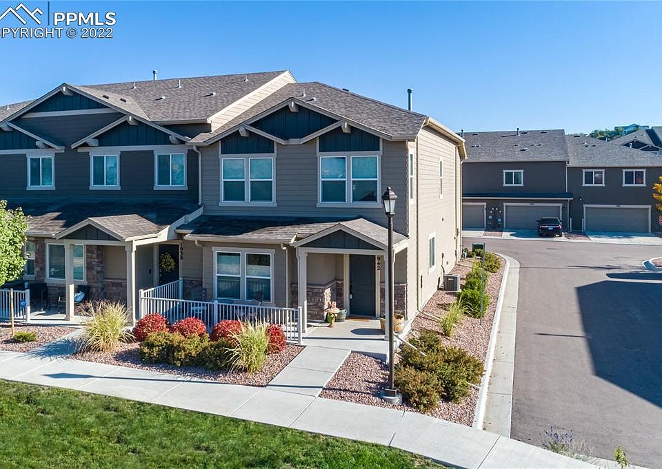 This wonderful end unit townhome sets at the Towns at Polaris Peak, a beautiful newer community with unobstructed mountain views. This is a maintenance free living area with so many ammentieis. This nearly new townhome features 3 bedrooms and 3 bathrooms, granite counters, high end vinyl wood flooring, upgraded cabinets, stainless steel appliances, beautiful MOUNTAIN VIEWS, and a double size garage. This community features a club house, pool, hot tub, playground, dog wash and dog park. This Wexford town home is the largest of the floor plans, with an extremely functional with an open concept living and kitchen area and the spacious 3 bedrooms all with walk in closets. The master bedroom is a favorite as there is optimal space for a seating area. Enjoy having dedicated laundry room on the second floor located between all the bedrooms. This almost new home is ideal and located close to Peterson AFB and Fort Carson.