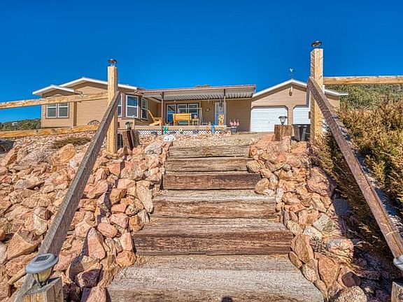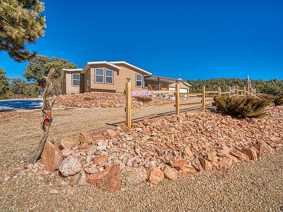 Outstanding home with three separate pieces of land totaling 19.12 gorgeous acres with unbelievable views of the Sangre De Cristos and the Wet Mtns. This home is a combination of sought after views, flawless upgraded impeccable home and storage for everything you own with an attached 2+ garage, a metal sided metal roofed 1200 sq ft detached garage, an 8' X 8' enclosed temperature controlled room, and another outside storage shed that's 240 sq ft The home sits off the road and it also is the end of the Fiberoptics line creating great reception. This 4 bedroom home has been totally remodeled including Rustic Alder cabinets mixed w/both 36" and 42", Granite countertops & center island, Stainless Steel appliances, beautiful bathrooms w/ceramic and accent tile, a beautiful master suite, vaulted ceilings and plant shelves, all new flooring, large windows throughout to enjoy the views. A custom pellet stove w/ a thermostat accents the "Great Room". There are two wishing wells on the property, a fenced in area out back, the trees surrounding the home are all trimmed back in case of fire, a deck off the dining room to sit and enjoy a huge deer family and Old Buck. A huge covered patio out front to relax and enjoy the mesmerizing views and peace and quiet. There is a huge covered carport and RV parking, a garden area that is completely fenced and covered and a quaint covered bridge from one lot to the next. The home and outbuildings all have matching metal roofs. A fantastic property!