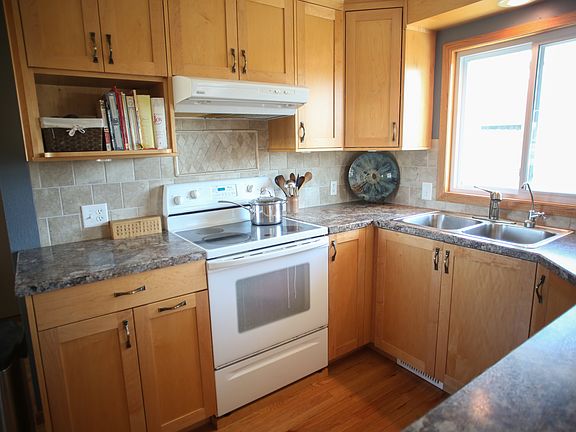 This ranch style home has abundant natural light and shining hardwood floors. It also boasts of an updated kitchen with custom maple cabinets (all soft-close drawers and hinges) and a remodeled, spacious main-floor bathroom with a wall-mounted toilet and handles for tub entry. There are three bedrooms on the main level, a main floor laundry room with half bath and gorgeous built-in cabinets in the living and dining rooms. The maintenance free trex deck leads into the fully fenced back yard which has alley access. The back yard has a mature ash and apple tree and there are raised-bed raspberry bushes in the side yard. This home has many additional updates, including all main floor windows, 2-stage high efficiency furnace, 75-gallon natural gas water heater, central air unit, hearthstone wood stove and reverse osmosis water filter. The double-car garage has been updated with great lighting, a 240-Volt appliance outlet, and an electrical sub-panel. The spacious basement has a large family room with new carpeting, a 3/4 bathroom, three non-conforming bedrooms and a storage room with lots of built-in shelves.