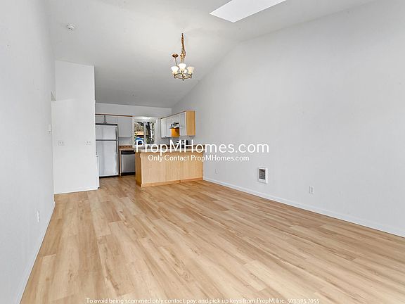 This home boasts a bright and airy living area with high vaulted ceilings and two skylights that fill the space with natural light. The open floor plan features modern laminate flooring and a seamless flow from the living area to the kitchen and outdoor patio, perfect for entertaining or unwinding.