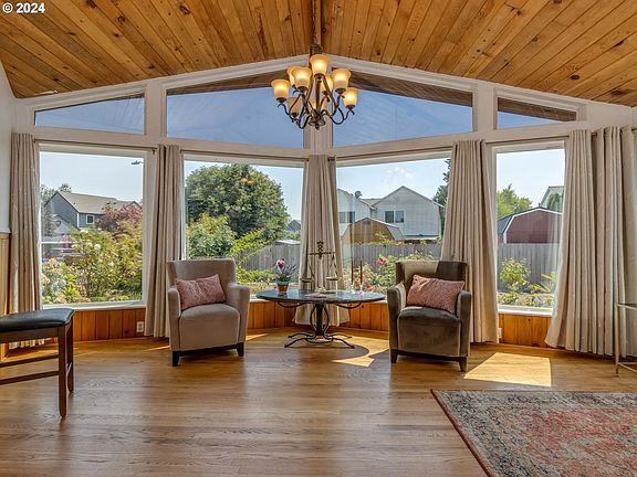 Relax in this beautiful one-level, custom built, NW Contemporary style home with many lovely updates & upgrades. New stylish carpets in great room and bedrooms. Kitchen has been modernized with hardwood looking LVP, Quartzite solid countertops, tile backsplash, faucet, instant hot water, garbage disposal, refrigerator & dishwasher. Abundance of cabinetry for lots of storage. In addition, a pantry and a built-in hutch to display your special dishes and/or collectables. Primary suite includes vaulted ceilings, ceiling fan, walk-in closet and freshly remodeled bathroom with walk-in tiled shower, new toilet, vanity with 2 sinks and quartzite counter. Hall bathroom with recently upgraded bathtub, toilet, vanity with quartzite and flooring. Vaulted ceilings throughout give this beautiful home a feeling of openness. Sunroom and entry room boasts lots of windows for light, hardwood floors and french doors. Sunroom square footage of approximately 180 SF, is not included in the county record square footage of 1509. New composition roof completed in 2021. 2023 upgrades include new gas service to outside gas meter and new gas line into the house. New cedar fencing in the backyard, new power service into the house panel and upper windows in the front of the home tinted. New exterior paint in 2024. Outbuilding is approximately 10' x 10' which makes a great tool or garden shed or a small shop. Large level lot, great for entertaining, gardening and/or room for your hobbies. Huge patio with a spot ready for a hot tub & electrical (no hot tub included). Fantastic location for shopping, schools, restaurants, parks and freeway access. This is what you have been waiting for!!!