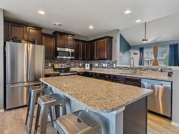 Absolutely stunning two story home in the very popular High Point at DIA. This remarkable home shows like a true model home and is loaded with fine finishes and quality upgrades. You will absolutely love the true open-concept floor plan and designer touches. The spacious gourmet kitchen is sure to please. Gorgeous slab granite counters, huge center island, Expresso colored cabinets, custom glass tile back-splash, extended wide plank wood grain ceramic tile, upgraded lighting, and stainless steel appliances - a must see!!! The large family room is flooded with natural light through the large windows and has a dramatic second story overlook. The main floor is complete with a guest bathroom, designer inspired paint, extended cabinets and a convenient laundry area. The second level features a luxurious master suite with a spa-like, remodeled bathroom. Here you will find a one-of-kind double vanity with a custom finished counter top, subway style tile, honeycomb floor tile and a relaxing tub with a gorgeous tile inlay. The perfectly situated and huge walk-in closet is to die for....There is a second bedroom, full bathroom and an open loft that is perfect for a second living area or in-home office. The full basement has soaring ceilings and would be the perfect space for a "Man Cave", theater, rec room, or bedroom. The large landscaped backyard has been meticulously maintained and is perfect for summer BBQ's. The full size storage shed in the perfect place to store your yard equipment and attachments. High Point at DIA Easy access to Denver, DIA, shopping, restaurants, and the new Gaylord Rockies Hotel. Enjoy community parks, pool and so much more!!! Hurry, this one won't last!!!