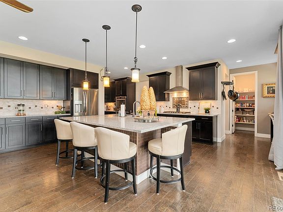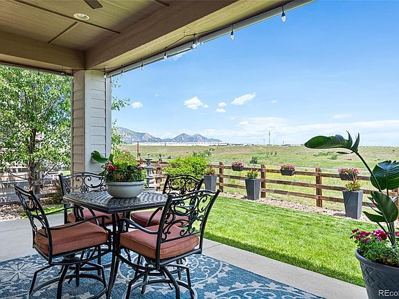 Stunning 2 story home backing Open Space! Nestled in the heart of Leyden Rock, this exquisite semi-custom home offers unmatched privacy, refined finishes, and sweeping open space views stretching toward the Boulder foothills and FlatIrons. From the moment you arrive, you’re welcomed by a stucco and stone exterior, four-car garage, and impressive curb appeal. Step inside to rich wood flooring, soaring ceilings, and an open, light-filled floor plan that seamlessly blends style and functionality. The Chef’s kitchen features sleek espresso cabinetry, granite slab counters, stainless steel appliances, an expansive center island with seating, and a generous walk-in pantry. Cooks of all abilities will appreciate ample area to move around without anyone under foot. Intimate glass-enclosed wine room with stone walls, perfect for entertaining or displaying a collection. Elegant dining room with a striking tin tile ceiling is adjacent to the wine room. Main floor office plus a separate home business center/mudroom combo—ideal for remote work or organization. High-end finishes and thoughtful design throughout. Upstairs, discover four spacious bedrooms and three full bathrooms. One bedroom has a private ensuite bath and the other two sharing a jack-n-jill bath including an oversized primary suite with a stone fireplace, panoramic open space and mountain views and a luxurious 5-piece en-suite bath with an oversized glass shower. Enjoy the serenity of backing to open space, where wildlife, sunsets, and endless mountain vistas provide a sense of peace and privacy year-round. The incredible covered patio covers the entire back of the home enticing many summer evenings outside gazing at the endless horizon from your private hot tub! This home truly checks every box—designer details, versatile spaces, luxurious upgrades, and a location that feels like your own private retreat. The Huge Basement is plumbed for a bathroom. Welcome Home!