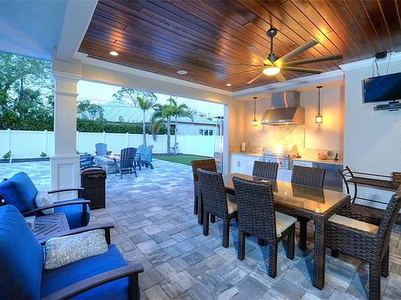 Coastal contemporary, luxurious, and sophisticated best describes this new residence. Perfectly situated in the prestigious West-of-Trail area on an oversized lot. The floorplan is a highly desirable layout, complete with ample open space, soaring living room ceiling and linear fireplace, and luminescent natural light creating an airy and relaxed atmosphere. The kitchen is an ode to culinary elegance with large center island, upgraded stainless appliances, beautiful quartzite surfaces, gas cooktop, wood cabinetry, and wine fridge and bar. A den/office offers flexibly while three-bedrooms are detailed with sleek finishes. Built to 2017 specifications, impact windows and doors bring peace of mind. A large game room welcomes good times and laughter. Outside, a covered outdoor living room includes a summer kitchen, welcoming memorable meals and festive memories. A resort-style pool was built in 2018 with a gas heated spa/pool along with 2 romantic firepits illuminating the lounge and gathering areas. This outdoor oasis is not to be missed. The residence also offers a full house natural gas generator by Kohler as well as an airconditioned 3 car garage. The back yard is maintenance free with pet friendly artificial turf. Located near top-rated schools, Southside Village, the Bayfront, Sarasota Memorial Hospital, and the arts and cultural offerings of downtown