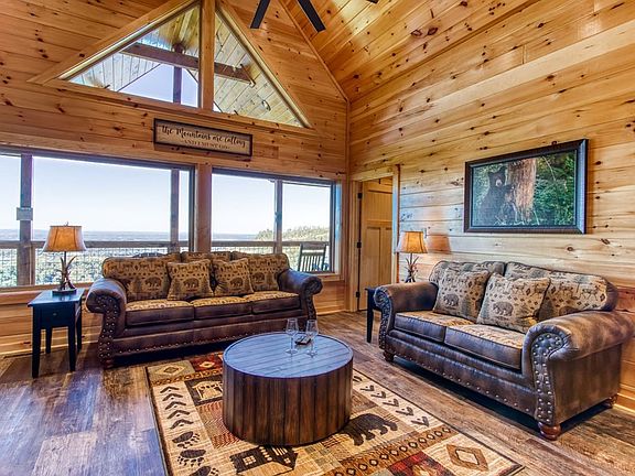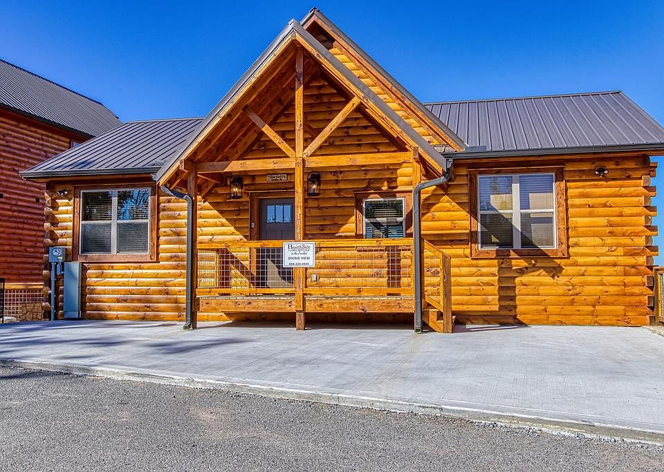 Divine View is a recently constructed (2021) all one level cabin. This mountain getaway offers luxury from the moment you step through the front door. You're immediately enchanted by the breathtaking panoramic views. Some of the many exceptional features include the soaring tongue & groove cathedral ceiling, stone fireplace, granite countertops, custom blinds & quality materials throughout. This property offers one bedroom, two bathrooms, with bonus room, offering an additional bedroom suite. Bonus suite features living room space with a two sided gas fireplace, two large screen televisions king size bed, futon, full bath with gorgeous glass enclosed tiled shower. Finally, a fun Multi-cade that features all of the 1980's greats like Ms. Pac-man, Donkey Kong, Galaga, and more! The master bedroom suite offers a king log bed, large flat screen television, decorative gas fireplace, gorgeous tiled, glass enclosed shower with large soaking tub and double sink vanity. Located in Hidden Springs Resort, this beautiful log home is modern in style and has numerous custom amenities throughout. Divine View sleeps six guests with comfort and relaxation around every corner. Your guests will instantly feel at home when they walk into the inviting beauty that is Divine View. From the kitchen area, loaded with everything you will need to prepare, and enjoy any meal around the oversized granite kitchen table. The cabin features an open floor plan with incredible views from any room. The living room with its cathedral ceiling gives way to a private covered deck with composite rocking chairs and your very own relaxing hot tub! Soak in the views by day or the stars by nightor kick back and rock your cares away! Divine View is only six miles from Dollywood theme park and Dollywood's Splash Country water park. Also, this cabin is only minutes away from other area attractions in Pigeon Forge, Gatlinburg and The Great Smoky Mountains National Park. Cabin is fully furnished and turn-key ready to welcome your guests. Location, beauty and breathtaking mountain views are featured in DIVINE VIEW. Call today to schedule your private showing! Drone Photography was used.
