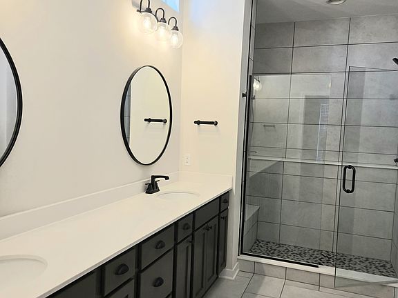 The main-level owner's suite includes a tray ceiling, a spa-like bath with designer tilework, dual vanities, a glassed walk-in shower, and a huge walk-in closet. Upstairs you'll find three additional bedrooms, a full bath, and a dedicated storage room.