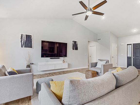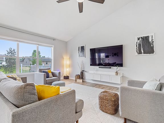 Discover this immaculate split-bedroom ranch situated in the highly sought-after Landmark Crossings neighborhood, embodying the epitome of elegance and sophistication. The interior spans across 1,868 sq. ft., showcasing a tasteful neutral color palette, exquisite wood plank tile flooring, and a spacious open-concept design. Bathed in natural light from large windows, the inviting great room boasts vaulted ceilings, a contemporary ceiling fan, and a sleek floating entertainment center that seamlessly blends with the space. The gourmet kitchen is adorned with recessed lighting, shaker-style cabinets, quartz countertops, a marble tile backsplash, stainless steel appliances (dishwasher replaced in 2022), a pantry, and an expansive island that is perfect for entertaining. The adjacent dining room is generously sized, accentuated by a chic light fixture and convenient access to the outdoor deck. Venture down the hallway to discover two sizable guest bedrooms and a well-appointed guest bathroom. The luxurious primary suite offers ample space and includes an en suite bathroom with a double-sink vanity, as well as dual walk-in closets for abundant storage. Additional features of this home include an attached 3-car garage, a mudroom with custom built-in storage cubbies, and a main floor laundry room with an upgraded washer and dryer set as of 2021. Unleash your creativity in the lower level, which presents an additional 1,868 sq. ft. of potential living space, including an egress window for the possibility of adding a fourth bedroom. The exterior showcases professional landscaping completed in 2022, a newly sealed driveway, and a freshly painted deck in the backyard, perfect for outdoor relaxation. Positioned within the top-rated Belvidere North High School district, this impeccable, move-in-ready home leaves no stone unturned in fulfilling your every desire!