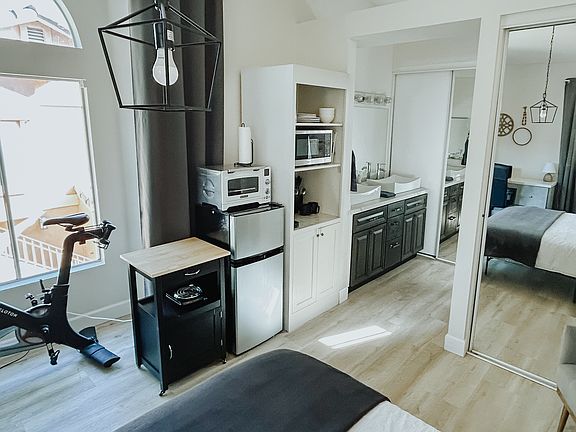 Sunny studio suite that comes with a Peloton! The unit has a private entrance and is attached. It can come furnished or unfurnished. Located in a quiet condo community only 3-5 minutes from Ralph's, Target, and lots of other shopping and dining; and also has quick access to the 241 freeway. The suite includes a kitchenette that will allow you to do light cooking. It has a hot plate that allows for cooking in a pot or pan, as well as a Kitchenaid countertop convection oven that allows for normal oven roasting/baking/broiling. You are able to bake pizzas, pot pies, cookies, etc. It also has a medium sized refrigerator with separate freezer, toaster, microwave, and other basic kitchen utensils. It comes with a memory foam bed, Peloton (no subscription included but it can still be used), an extra large built in desk with chair and storage, two large closets, , kitchen storage cabinet and cart, vanity with double sinks (one can be designated for kitchen use), walk-in shower, laundry located on the patio, and convenient parking close to the unit. Please note, I am looking to rent to only one person. (As a professional photographer, I took the photos myself)