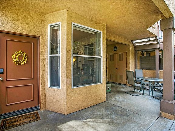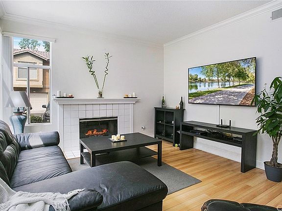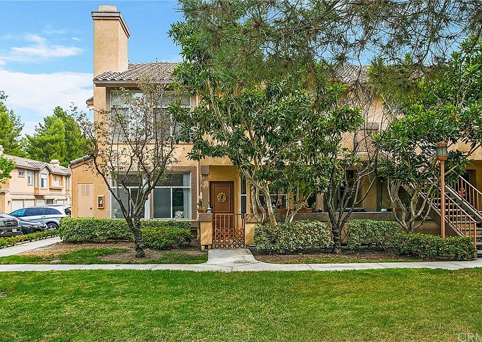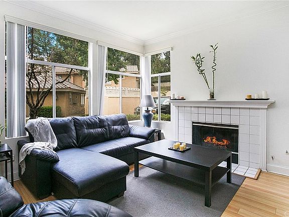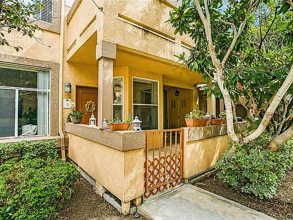 Prime location in the gated Tuscany development! This lower level condominium faces a large grassy area with matures trees and has a front enclosed patio with iron gate entry. The open floor plan boasts high ceilings and laminate flooring throughout. Light and bright living room features numerous windows, crown molding, cozy fireplace and an eating area which is nestled by a bay window. The kitchen comes with stainless steel appliances and refrigerator, a full sized pantry and breakfast bar that opens to the living room. Large master bedroom offers a ceiling fan and slider that opens to the patio. Ensuite bathroom with double vanity sink, walk-in travertine dual-headed shower and sliding mirrored wardrobe. Ceiling fan and two mirrored closets in second bedroom. Detached one car shared garage with storage locker just steps away. Laundry closet on patio fits full sized washer and dryer. Enjoy all of the amenities that Tuscany has to offer: pool, spa, clubhouse, fitness center, tennis court and even a putting green! Located just across the street from Foothill Community Park and close proximity to Borrego Park, Foothill Library, shopping, dining, entertainment and Whiting Ranch. With just a little TLC, this property will be a great home or investment!