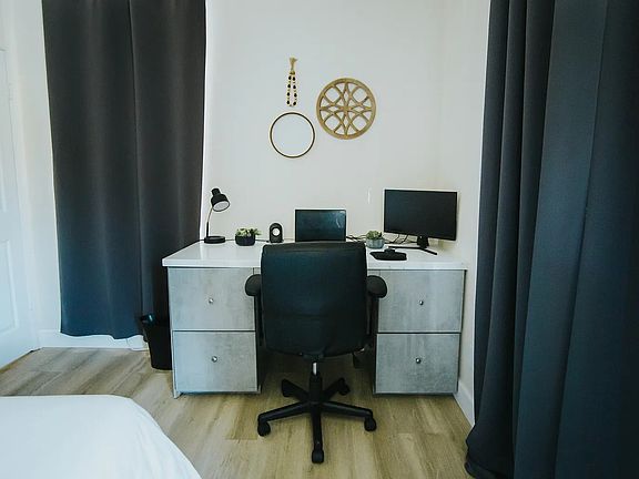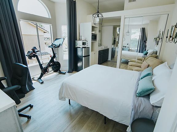 Comes with a Peloton! This is a studio suite with private entrance attached to a condo in a quiet community. 3 minutes to Target, Ralph's, dining, and the 241 freeway. No one above or below. Your modern, stylish suite can come furnished or not. (I am a professional photographer who took the photos myself) It comes with a peloton (no subscription but you can still use it), large built in desk with lots of storage, desk chair, queen memory foam bed, two extra large closets, kitchenette with large fridge and separate large freezer, microwave, oven, hot plate, basic kitchenware, lots of kitchen storage in cabinet, bathroom has double sinks (one can be for kitchen), walk in shower, rain shower head, laundry is shared with me only and is located right outside front door on the patio, and parking is never far from the unit. The condo has a huge patio with dining area and lounging area to be shared with me. You will also have access to the community gym, pools, etc. The suite has a private entrance but is attached to my condo, where I reside. The bedrooms do not share a wall. I am a quiet and considerate 40 year old female professional. I am looking for someone who is also considerate and wouldn't mind using earbuds when playing louder music or shows, etc. I do the same. Please also understand I am only interested in renting to one person. 3-6 months, then month to month.