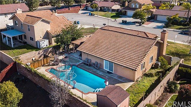 Beautiful Orangecrest, Single Story, Cul-de-sac, pool home that will charm your pickiest of buyers. Enter this home and land in the living room which features a fireplace and custom plantation shutters. Wrap around and find the dining room and a spacious kitchen that has wood flooring, corian countertops, plenty of cabinetry and a breakfast nook. The 3 guest rooms are spacious and one has an exit to the pool/spa with private glass doors. The master bedroom has high ceilings, a large closet, slider with custom shutters and an attached master bath. Off the kitchen you will find a bonus room for the kids to watch their shows or for the adults to relax and unwind. The laundry room is located indoors. This home has ceiling fans throughout to lower your A/C bill in the summer months. Step out to your entertainers paradise and find a lap pool with a featured jet-powered swim lane for that avid swimmer. The pool has an attached spa for your relaxation. The backyard has a fire pit, patio cover and block wall surrounding the backyard. This home is in a prime location in Orangecrest. Walking distance to Bergamont Park, Twain Elementary and to the Kohls and Albertson's shopping center. Lowest tax rate in the county, no HOA. This home won't last. Come see it today!