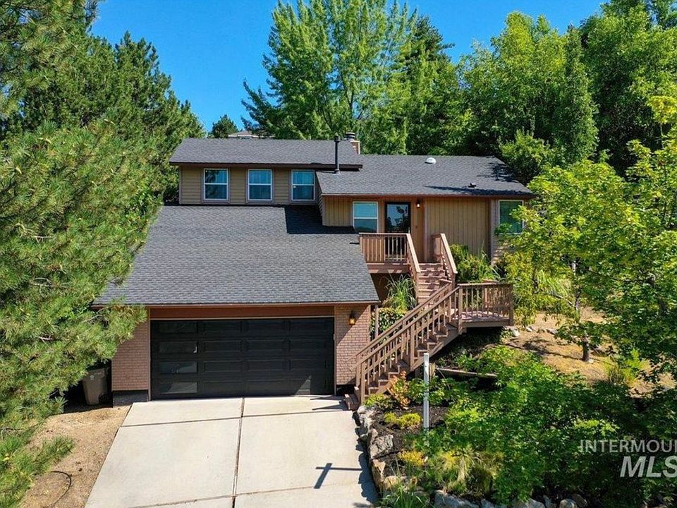 Close to St. Luke's, downtown, and nearby hiking and biking trails! Option to be furnished. This updated, contemporary tri-level is a rare opportunity to live in the highly sought-after Foothills East community in northeast Boise. Up & away from the busy city but just minutes from everything including nearby wilderness. Main level entry reveals a dramatic drop-beam vaulted ceiling over the Great room area enhanced by natural wood accents, large windows and red brick fireplace. The bright kitchen overlooks tree tops to Boise as the Great room flows to a tranquil park-like backyard and deck where relaxation and occasional deer visits are certain. Tree-top city views from the spacious upper level master suite with large walk-in closet, soaking tub and it's own fireplace is separate from other bedrooms and their own bathroom on the lower level which also leads to two-car garage