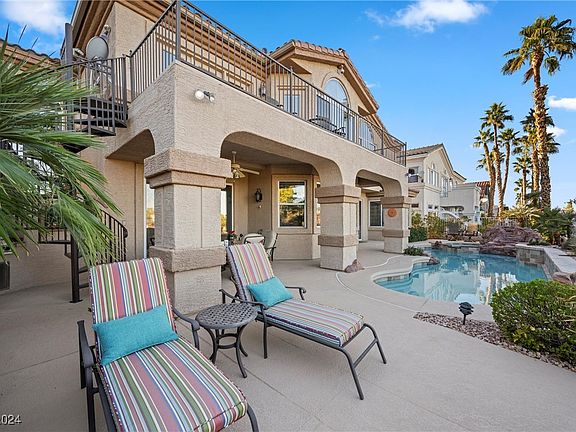 Mr & Mrs Immaculate live in this 4 bedroom beauty that backs to Legacy Golf Course in the heart of Green Valley. The only owner & the pride of ownership is outstanding. Gorgeous home with office downstairs. Formal living & dining room, kitchen with granite counters, pantry & breakfast nook, family room with fireplace & wet bar, the wet bar has a window for serving your poolside guests. Split staircase to 2nd floor, stunning primary bedroom w/ balcony access, 3sided fireplace, two w/i closets, romantic primary bath with unique split sink design. The balcony can also be access from pool by outdoor spiral staircase. Two bedrooms share a jack & jill bath, & one has it's own private bath & two have w/i closets. Loft with built in desk & cabinets & access to the balcony from which you can see the strip to the west, mountains to the west & golf course right in front of you. Guard gated community, on other side of Wigwam is Bartlett Elementary & around the block from Greenspun Middle School.
