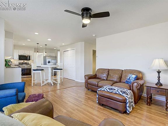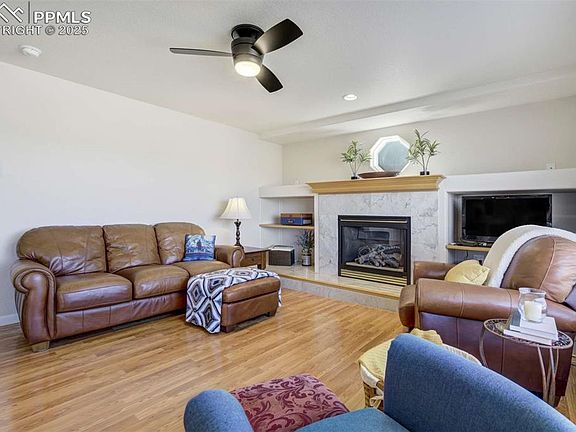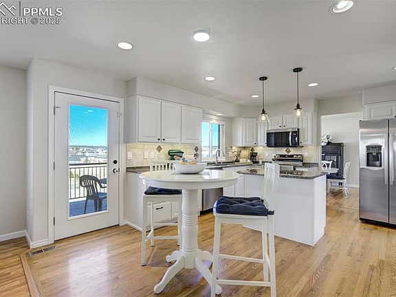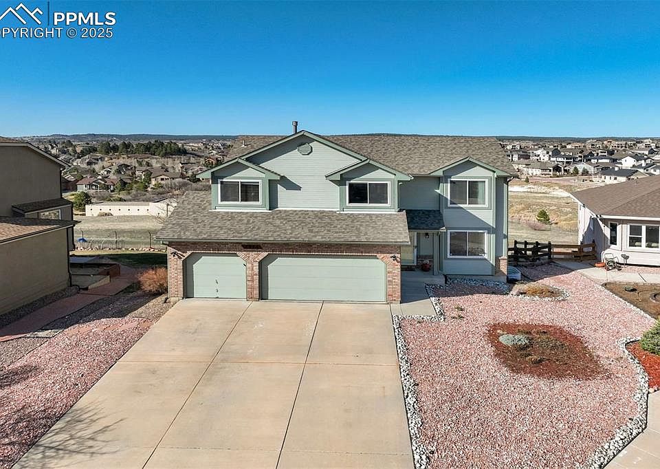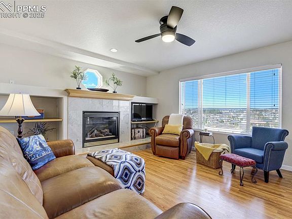 Set at the end of a quiet cul-de-sac in Trail Ridge at Northgate, this 4-bed, 4-bath two-story offers Pikes Peak views. The easy walk-out access to the newer Trex deck provides for elevated (~7,000 ft) vistas - perfect for serene outdoor dining or morning coffee. Backs to city owned water storage facility providing, safety, security, privacy and lots of open space. Located in District 20, just minutes from I-25, Interquest, The Classical Academy, & the shopping, dining, & services at Interquest Marketplace, this property delivers both convenience & comfort in one of Northgate’s most accessible locations. Inside, the layout is bright, open, & move-in ready, featuring hardwood floors throughout the main level, large windows to capture the view, & a spacious family room w/ gas fireplace & built-in shelving. The kitchen is updated w/ granite counters, stainless steel appliances, newer cabinet hardware, a center island, & breakfast bar w/ pendant lighting. Upstairs, the primary suite features vaulted ceilings, a walk-in closet, & a 5-piece bath, while two additional bedrooms share a full hall bath w/ updated finishes. The upper-level laundry keeps daily function simple. New carpet throughout brings a fresh, clean feel. The finished walkout basement to the garden-level patio adds valuable living space, featuring a generous light & bright rec room, a fourth bedroom, & an updated full bath—perfect for guests, teens, or multi-gen living. Additional updates include a new furnace (2023), central A/C, & energy-efficient vinyl windows. The backyard is fully fenced, & the 3-car garage provides plenty of room for storage or parking. Well-kept, move-in ready, & located in a neighborhood w/ great schools & accessibility, this home offers both comfort & everyday functionality in one of Northgate’s most desirable areas.