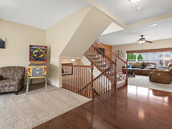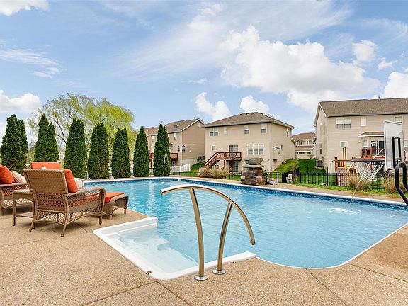 You are sure to be the envy of your friends and family this summer as you entertain in style in your private backyard paradise. The custom sports pool offers the best of both worlds with shallow areas on each end and deep in the middle. It features 3 fountains and a nighttime custom light show like no other. Low maintenance salt generated system for easy upkeep. The home offers 2882 sqft plus a finished lower level with full bathroom. There are 9ft ceilings on the main floor and a 9ft foundation pour. The light & bright kitchen features lots of 42in cabinets, a butterfly island with granite top, top of the line stainless steel appliances and 2 serving bars one with a wine rack above. The great rm boasts a gas fireplace and bay window overlooking the backyard retreat. Upstairs is the king-sized master bedroom suite with private luxury bath and huge walk-in closet. There's dual heating & cooling, lots of hardwood floors, white doors & trim, a brand new roof & more