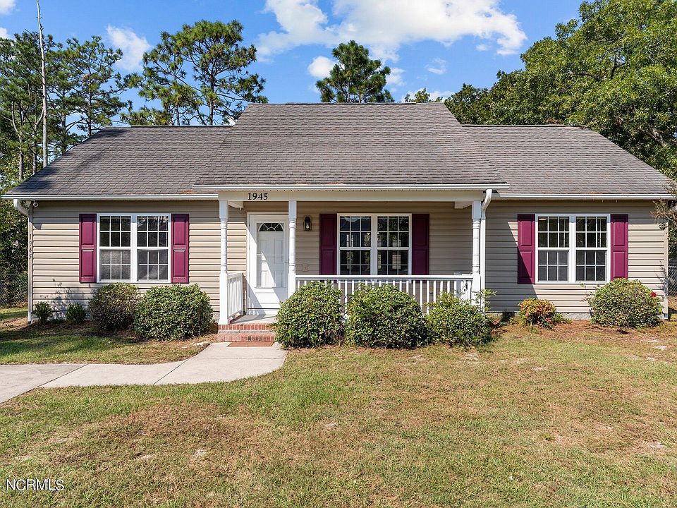 The living room features a cathedral ceiling, laminate plank flooring, and natural light from the front and back windows. The split floor plan has the master suite on the left and the two additional bedrooms and shared bathroom just off a short hallway from the living room. The kitchen features granite counters and plenty of storage.