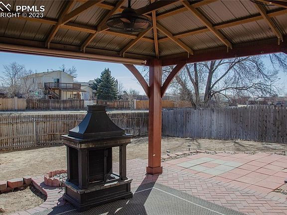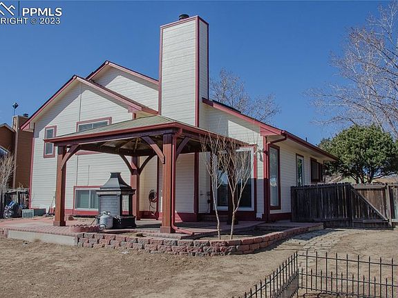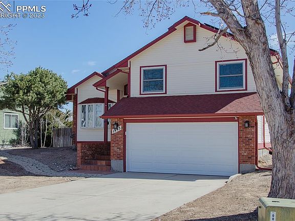 Charming Tri-Level with finished basement in Constitution Hills! 4bed/3ba/2 car garage, 2,038 sq. ft., including Solar Panels. Ceramic tile exterior front stairs to the large front door. The living room features laminate wood flooring, vaulted ceiling with ceiling fan and 2 skylights, new interior paint throughout, wood fire place with walkout to large paved patio with pergola, with shades on each side. The kitchen includes counter tops and backsplash with a granite overlay, garden window, pass through breakfast bar; eat in dining nook in the kitchen has a bay window. Updated wood stairs with iron rods and wood stairs leading upstairs and lower level. Upper level has a full bathroom with newer vanity top and new paint; 3 bedrooms all freshly painted, new doors; primary bedroom does have an adjoined bathroom with double vanity, tub/shower and new paint. The lower level has walkout to garage, new paint, cedar wood under built in nook, half bath with updated vanity top and new paint, large linen closet and washer & dryer hookups and/or additional storage closet, carpet & ceramic title. The basement could be set up as a rec room or a 4th bedroom, large laundry room, new paint and baseboards. Large fenced backyard and large front in cul-de-sac. Close to Peterson Base, 20 minutes from Ft. Carson, shopping, schools & restaurants.