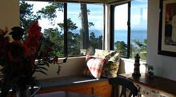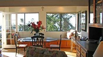 Cambria charming home set among the Montery Pine trees with fantastic panoramic ocean views. This home takes advantage of the sunlight and ocean views. Many large picture windows, vaulted open beam ceilings, real wood burning fireplace in the living room with rock face and plenty of room to watch the breathtaking sunsets for all of your family and friends. The dining area has wood floors and a built-in window seat. Open up the french door and step onto your ocean view west facing deck. The kitchen has tile counters, a pantry and the refrigerator is included. The master bedroom has a walk-in closet, a full bathroom and an ocean view right from the bed. There is a fully finished two car garage with lots of storage cabinets.