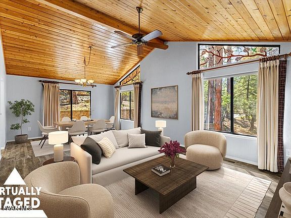 Tucked away on a peaceful side street in the sought-after Hidden Valley Ranch community, this home enjoys a private setting surrounded by majestic Ponderosa pines, creating a serene, forest-like retreat. The seller is also open to offering a seller carryback, making this an excellent opportunity for buyers seeking flexible financing options. A welcoming front exterior and expansive driveway with a convenient turnout set the tone for the property's sense of space and tranquility.Step inside to a bright foyer that opens into the inviting living room and the adjacent formal dining area, where natural light streams through numerous windows. This space has a stunning tongue-and-groove wood ceiling with exposed beams, adding warmth and character to the space. A previously enclosed wall has been opened to create a seamless flow between the living and family rooms. The family room features a striking floor-to-ceiling brick fireplace with a custom hearth and mantel, plus a sliding glass door that leads to an expansive engineered rear deck, perfect for relaxing or entertaining while enjoying peaceful woodland views.The thoughtfully designed kitchen boasts granite countertops, crisp white raised-panel cabinetry, and a stylish tile backsplash. A dining peninsula provides additional seating, while stainless steel and black appliances, including a Bosch smooth-top electric range with a convection microwave above, blend practicality with modern appeal. A light-filled breakfast nook overlooks the backyard making this kitchen as functional as it is charming. The refrigerator, washer, and dryer all convey with the home.The spacious primary suite offers a true retreat with its oversized sliding glass door opening directly to the rear deck. The ensuite bathroom features dual granite vanities, a jetted soaking tub, a walk-in shower, a skylight that bathes the space in natural light, and a large walk-in closet.Generously sized guest bedrooms come equipped with ceiling fans, one offering a double closet for extra storage. The guest bathroom is beautifully finished with a solid-surface stone vanity and a walk-in shower.A well-equipped laundry room provides a deep sink, abundant cabinetry, and easy access to multiple storage closets and nooks throughout the home.On the lower level, a large flexible space with a wall of windows and a half bath invites endless possibilities, ideal for crafting, hobbies, or a private studio. There's also a spacious mechanical room for easy access to the HVAC system and the newer (2019) 40-gallon water heater, as well as an additional storage area with crawl space access.The oversized two-car garage includes insulated overhead doors and a dedicated tool and storage room. Outdoors, the gently sloped backyard offers a quiet haven to enjoy nature and observe local wildlife. Thoughtful landscaping features terraced garden beds and water-wise drip irrigation for easy care.Additional features include a natural gas stub for a permanent BBQ, solid-core interior doors, and a central vacuum system, all enhancing comfort and functionality throughout the home.