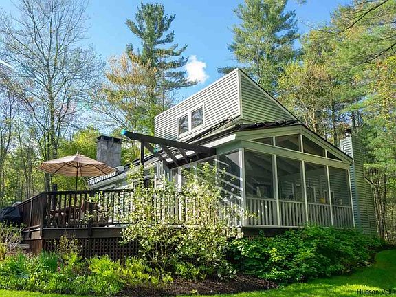 Welcome to the perfect Woodstock retreat just two miles from town, a stunning contemporary home privately set on 2.6 beautifully landscaped acres with a stream-fed pond and a family of koi. A landscaped and paved driveway leads to this immaculate home with a fully deer-fenced yard and separate two-car garage. The pond beckons as you enter the gorgeous gardens, framed by towering pines for complete privacy. There are even raised beds and a gardening shed, perfect for the weekend gardener! The vaulted great room is flooded with light and features a stone fireplace, built-in bookcases, skylights and wood floors. The dining area adjoins a new, gourmet custom kitchen. Step right out from the kitchen into the vaulted screened-in porch, perfect for candlelit dinners or an afternoon reading. A deck with an awning connects the porch and great room, perfect for outdoor living. There are two bedrooms on the ground floor, one currently being used as an office with custom built-ins. The newly-renovated ground floor bathroom has an air-jetted BainUltra tub beneath a picture window, framing the garden views. The master suite is upstairs, and features a vaulted ceiling, sprawling custom California closet and newly-renovated master bath with large glass enclosed shower, marble tiles and double vanity with marble counter top. The Samsung washer and dryer are conveniently placed in the master suite. This energy-efficient home has been upgraded and lovingly maintained for ease of living, including a whole-house generator, solar panels that reduce energy bills substantially, water softener, whole house air exchanger (HRV), and two hot water heaters. This south facing, light filled home is move in ready, just in time to enjoy summer in Woodstock.