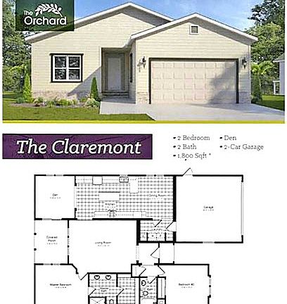 Our largest new home floor plan called: The Claremont. Almost 1,800 sq ft, large living room, impressive kitchen with tremendous work and entertainment space. This plan has two spaces off the kitchen which either would work as a dining room or as a den. Home comes with a generous two car garage and private, rear porch. Our last new home in our amazing, amenity-filled community, The Orchard.