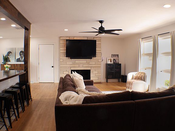 Southern Hills walking distance to schools shopping and restaurants. Tastefully decorated and remodeled with Open Floor plan spacious wood top island all new cabinets in high gloss beige, stainless steel appliances including refrigerator, gas top stove, wall oven and built in microwave. Seller is leaving the Samsung Smart Washer and Dryer as well. Plumbing upgraded to Pex and Gas lines were added to stove and fireplace. Original hardwoods were refinished. Master bath updated with soaking tub and a walk in shower w/double sink vanity. Hall bath toilet and plumbing updated but saved the pink tiles for the era of the home retro style. New 220 wiring added. Wood Beams separate the entry from the Great Room giving the home warmth and style. Irrigation System in front and back for a lush green yard. Fenced yard. New Roof March of 2022.