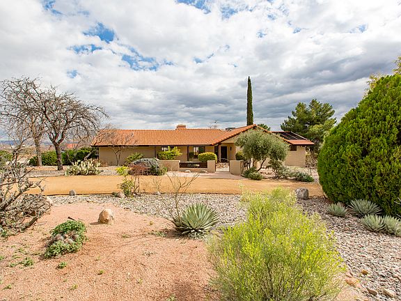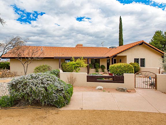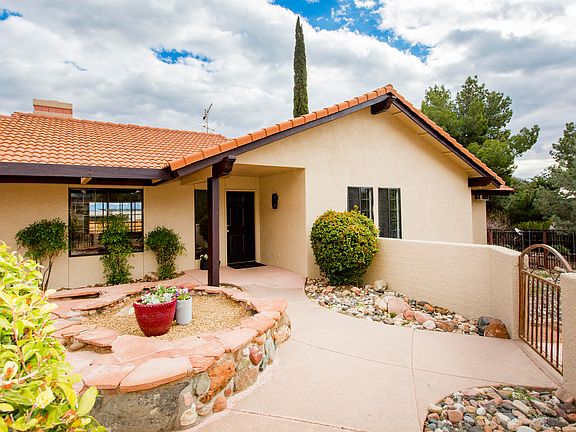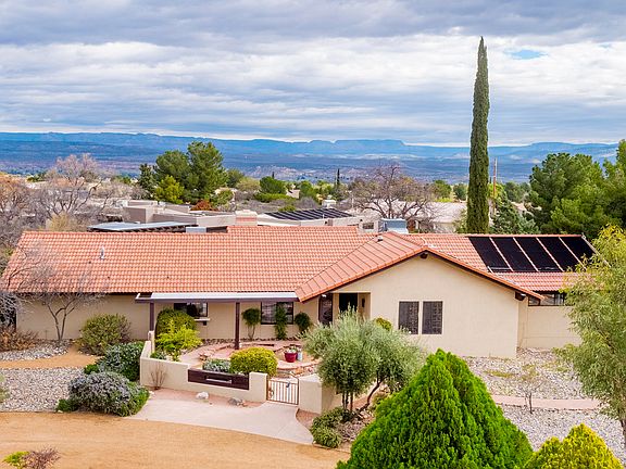 Contemporary home with great views of the Verde Valley. Curb appeal will catch your eye with the native high desert Zero-scape, stucco exterior, tile roof and a circular drive with a serene front courtyard nestled just below the Mingus Foothills. Upon entering the home you will be captured by the tongue & groove vaulted ceiling. The sunken living room is large and accompanied with a cozy wood burning fireplace and big windows that look out at the huge red wood deck, fenced backyard, diving swimming pool and Red Rock views in the clear distance. There is plenty of room for many options in this great room floorplan. The bedrooms are a generous size, all with walk in closets. The master has floor to ceiling windows, cedar closet and a Zen bathroom with separate soaking tub & walk-in shower.
