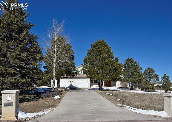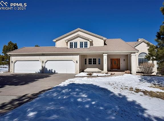 From the moment you step inside this home, you are greeted with unique architectural elements from a mosaic tile medallion star in the entry foyer, to the unique arched walls, decorative inlays, and vibrant fresco multi colored textured paint accents.5 BR,4 BA,4 Car Grg.2-Story custom home on 2.5 acres of land w/ Walk-Out Basement. 5,152 sq ft allows for ample multi-purpose flex space,for home schooling,exercise rm,craft rm+so much more. Working or Learning from home? No problem,5 BR+a main level office+kitchen computer nook. 4 car garage accommodates all your vehicles,hobby,workshop and storage needs. Bonus attic storage is accessible by a pull-down retractable attic ladder. 2 Furnaces,2 Water Heaters,3 Gas Fireplaces+Central A/C, Humidifier,in-wall Central Vacuum and a Tile roof with recent roof certification. Office has built-in wood bookcase+bay windows capturing mountain views through the trees. Living Rm enjoys vaulted 18+ foot ceilings,fireplace with a multi-tiered mantle,large picturesque oversized windows and great natural light. Entertaining-friendly floor plan where the Living rm flows through a unique sculptural partition wall with curved openings to a formal separate dining room that boasts elegant 3-tone hardwood floors,vaulted ceilings and more bay windows. Gourmet kitchen features a granite stone surface overlay countertop,custom cabinets with pull out shelves,built-in corner rotating turntable,in-kitchen computer desk and writing center,hideaway small appliances or bread box cabinetry, magnetic wall knife set holder,5-gas burner,pantry+breakfast bar counter seating. Whole house audio speaker system. Laundry chute. Master suite is enormous w/fireplace,HUGE walk in closet and spa bath suite of royal dimensions. Bonus private Master upper-level wrap around martini balcony is the perfect viewing deck with Pikes Peak views. Basement has family rm/rec game rm,full kitchen size wet bar and walks out to patio and playground set. CLEAN AND READY TO MOVE IN!