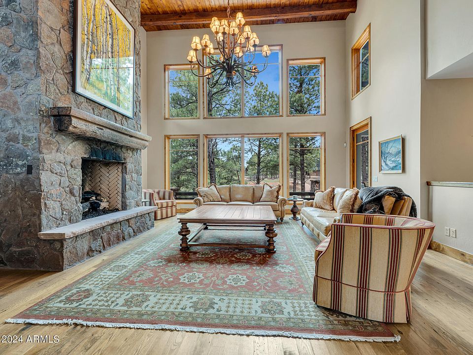 As you step through the inviting Foyer, you are immediately captivated by the dramatic Great Room. Rustic reclaimed wood floors, a towering stone fireplace, and bold timbers create a warm and welcoming atmosphere, while the floor-to-ceiling windows offer breathtaking views of the San Francisco Peaks.