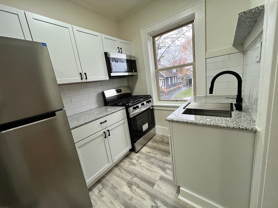 Renovation includes; new flooring, granite kitchen counters, new stainless steel appliances, new kitchen cabinets, new tub surround, and fresh paint throughout.