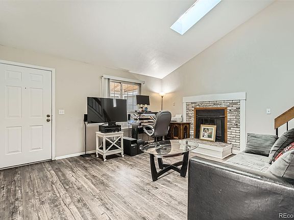 This charming two-story home features four spacious bedrooms and three bathrooms, offering a blend of comfort and functionality. The inviting living room is highlighted by soaring ceilings, a skylight that floods the space with natural light, and a cozy brick-accented fireplace, perfect for relaxing evenings. The open-concept dining area flows seamlessly into the updated kitchen, which boasts modern white cabinetry, sleek countertops, and black appliances.