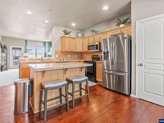 This beautiful townhome in South Salem's desirable McKenzie Ridge Estates offers amazing views & is a true end unit. It features a 2-car garage, beautifully finished interior w/hardwood floors & all new carpet in 2024. The light & bright kitchen comes with a breakfast bar that opens up to a great room w/gas fireplace & a balcony/storage. Two master suites w/en suite bathrooms & walk-in closets. 9 ft ceilings. New AC Unit in 2022. HOA covers ext. maintenance, ext. insurance, landscape & more. Must Visit!