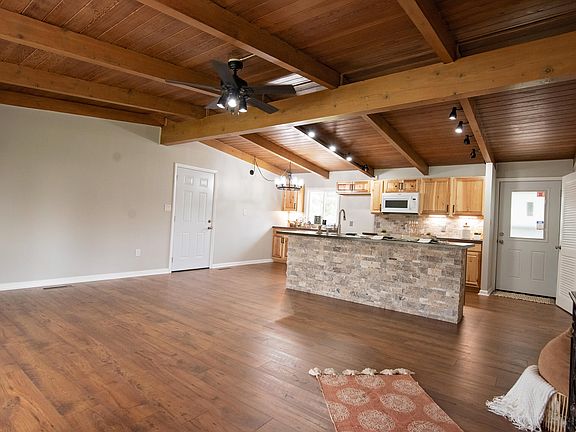 Use the large covered porch (20x10) to rest and relax any time of the day. Once you walk inside you will be in love with this new & improved version of a flowing floor plan. The living room blends well with the open kitchen lay-out to create a great room affect. The over sized island adds seating & counter space. Tons of hickory wood cabinetry for storage plus a trendy black countertops. The stone backsplash pulls the look all together. The vaulted ceilings throughout adds more volume to the spaces from room to room. The wood matching flooring (LVP) compliments the wood beams. Nice lighting used in addition to spotlighting. Storage is ample. Utility room houses mechanicals as well.