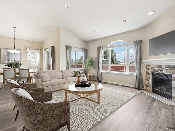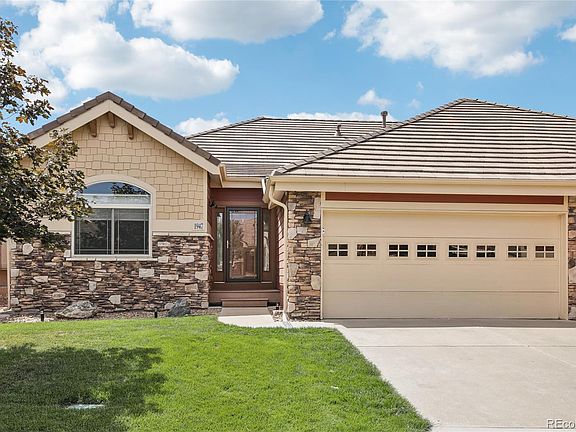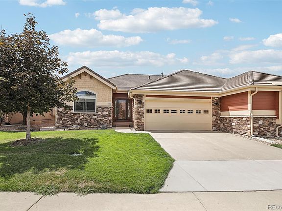 This easy-maintenance ranch patio-home style townhome is the perfect to call home! Located in Erie's desirable and peaceful Heritage At Vista Ridge neighborhood, this community is welcoming, with neighbors who gather for coffee in the winter and at the gazebo in the summer. Lock-and-go features, you can travel worry-free, knowing all exterior maintenance and lawn care are handled by the HOA. The area is very well maintained and always has a good appearance. Rare to find, this home is one of just a few in Heritage at Vista Ridge with 4 bedrooms & 4 baths! Inside, the home boasts a great, functional open floor plan with a grand living room, dining area, and kitchen, all featuring vaulted ceilings and LVP flooring. A sliding door off the dining area leads to a large deck, ideal for entertaining and relaxation. The main level includes two bedrooms lo located on opposite ends, with a spacious primary bedroom offering a large walk-in closet and a 5-piece en-suite. The main level laundry room is equipped with ample storage for easy laundry days and provides access to the attached garage. The expansive basement features a family room that can easily be divided into separate spaces, with plenty of light from garden-level windows. There are two additional roomy bedrooms in the basement, both with large walk-in closets. Recent updates enhance the home's appeal: new carpet and vinyl flooring installed in 2019, a fan added to the fireplace insert in 2019 to exhaust heat into the living room, a retractable awning with a wind guard installed in 2021, a Pella full glass storm door installed in 2019, and all bathroom fixtures and lighting replaced in 2022. A radon mitigation system was installed in 2022, with a second system added in 2023, along with a sump pump and a new 50-gallon gas water heater. Located just blocks to National Golf Club, community center, 2 pools, tennis courts & exercise facilities, and easy access to highways, grocery stores, banks, and hardware stores.