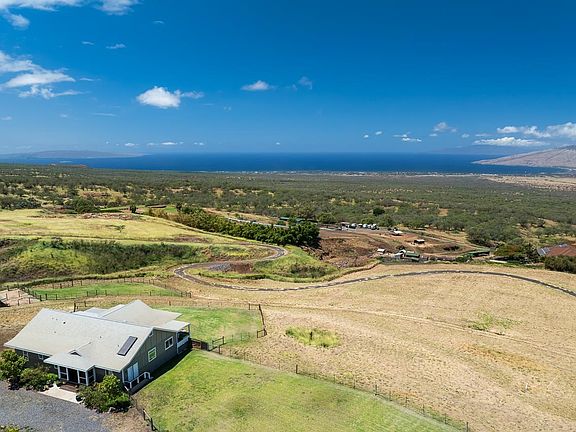 Panoramic bi-coastal ocean and neighbor island views. Experience stunning sunsets and gorgeous Haleakala and West Maui Mountain vistas. This modern single-level countryside home is set on 7.58 pastoral acres. The upscale home has elegant finishes throughout and is being sold furnished. Expansive windows that fill the rooms with natural light and capture the exceptional views. The three-bedroom layout includes a large primary suite with en suite, plus two additional bedrooms and two bathrooms. Every feature in this home has been thoughtfully chosen to support a refreshing, open concept focused on elegance, comfort, and a seamless flow for entertaining. Miele appliances, two refrigerators, Ipe decking on the lanais, and custom cabinetry exude quality. Additional features include gas fireplace, solar water heater, and fenced in yard area. Located towards the bottom of Naalae Road with a gated entry, this private and peaceful upcountry home offers a serene atmosphere that truly encapsulates its vibe. One of the sellers is a licensed Hawaii real estate broker. This is the Unit A of a CPR property.