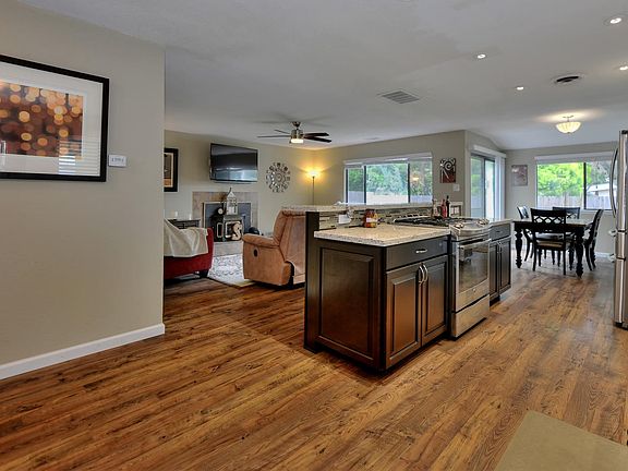 Beautiful updated single story 3 bedrooms 2 bath home on a sizable corner lot. Great neighborhood and K-5 elementary school! Enjoy the stunning kitchen w/ quartz counters, a breakfast bar and new designer cabinetry in an antique white finish. A true open concept floor plan w/ a great room feel, the living room features a gas pellet stove fireplace insert & picture windows overlooking the backyard. Updated wood laminate flooring throughout. Both large side yards offer an incredible opportunity for secure RV or boat storage, garden, play area. Two-car garage w/interior access, provides ample room for parking, storage and a workshop.