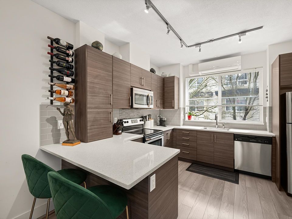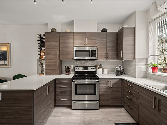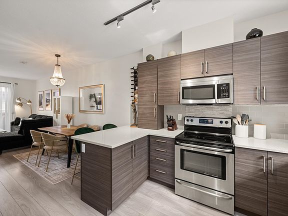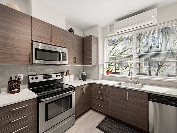 Beautiful 2 Bed + Den townhome with full driveway & brand new A/C! Ground-level entry features a den/home office (could be a small 3rd bedroom), 2-pc bath & garage access. Main floor is bright and open with laminate floors, stainless steel appliances, spacious kitchen, and deck with NW exposure at the end of the complex. Upstairs offers 2 large bedrooms, large ensuite with double sinks, custom built-ins in the primary, and laundry. Enjoy the fenced yard with turf, perfect for pets or kids. Bonus: park your work truck in the full driveway! Well-maintained development in a great location.