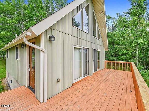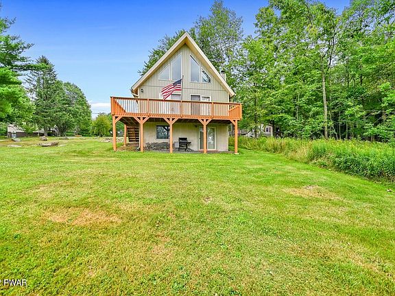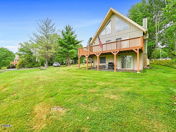 BEAUTIFUL VIEWS from this Chalet Home located in a four-season amenity filled community in The Northern Poconos, just two hours from the NYC and Philadelphia Areas. This home has three finished levels, an open floor plan, free standing propane fireplace, knotty pine ceilings, great views from the classic chalet windows, and a loft. The walk out lower level is a huge open recreation room. There's also a large deck where you can enjoy the views. Located on a nice property of nearly a half an acre and is within close proximity to the amenities. This home is neat as a pin. Please remove shoes or use shoe covers provided. The amenities include lakes, beaches, pools, clubhouse with restaurant and pub, golf course, ski hill, tennis, indoor recreation complex with tennis/fitness center/arcade and more, basketball courts, ball fields, children's playground, miniature golf, walking trails, arts and crafts, a great recreation program including day camp for kids, campground, 24 hour security, gated access, must have an appointment with an agent to tour the community.