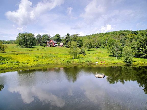 BIRCH FELL- One of a kind architectural gem created from a 1860's Vermont Barn. The original structure has undergone an amazing transformation into a sophisticated space sitting on 30+ acres with views for miles. The house is perched over a stunning swimming pond with meadows on all sides. The interiors are inviting, tastefully decorated while strategically keeping warm, original woodwork. There is ample space for family gatherings and entertaining in all seasons. The Silo that was added houses the central dining area, a sunroom, and an incredible lookout to the easterly views. The main living room is stunning with a barn-bean timber frame, large central fireplace, and high vertical windows to gaze out on the ample scenery. There is also a spectacular deck located off this space. The grounds are lovely with colorful perennial gardens, Birch Groves, and a cascading series of smaller ponds and waterways that feed the main pond. The property is minutes from Barnard Village, Silver Lake and close to the best of the Upper Valley including the quintessential Woodstock.