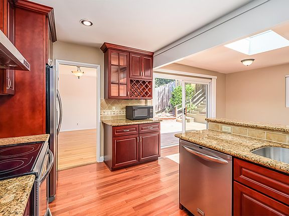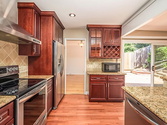 Located in the sought after Oakmore neighborhood, this rarely available single family home includes 3 bedrooms, 2 bathrooms, and 1584 square feet of living space. It features a remodeled kitchen with stainless steel appliances, granite counters, hardwood floors and cherry wood cabinets, and an adjacent family room with a skylight. The dining room and huge living room, with wood-burning fireplace, look out the wall of front windows. Hardwood floors and honeycomb shades adorn this wonderful home. The downstairs bedroom has newer carpet and it's own remodeled bathroom. The upstairs hall bathroom is updated and includes a bathtub with shower. Attached 2 car garage. Private backyard with low maintenance landscaping and views from the upper level. Washer, Dryer & Refrigerator included. Available August 1, 2025. No smoking. No dogs. Tenant must provide renter's insurance policy. Tenant pays all utilities. One year lease. $4995.00 rent per month. $5000.00 security deposit. Tenant income must be three times monthly rent. Call Mary Jane, Realtor, for more information and a showing appointment. 3 Bedrooms, 2 bathrooms, 1584 square feet, 2 car attached garage,inside laundry room, private backyard