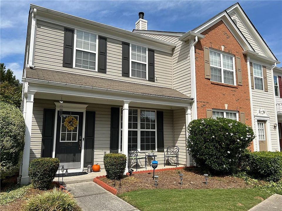 This fantastic end unit townhome boasts abundant greenspace at the back and side, offering a peaceful retreat. Located just minutes away from Kennesaw State University, Kennesaw Mountain, Shopping & Restaurants, it provides both convenience and tranquility. Enjoy privacy on the rocking chair front porch. The great room features a fireplace and hardwood floors, creating a cozy atmosphere. The large eat-in kitchen is equipped with stainless steel appliances. Upstairs, two spacious bedrooms each have private baths with airy, vaulted ceilings, walk-in closets, double vanities, and garden tubs. The layout is ideal for roommates, making it a comfortable and inviting living space.